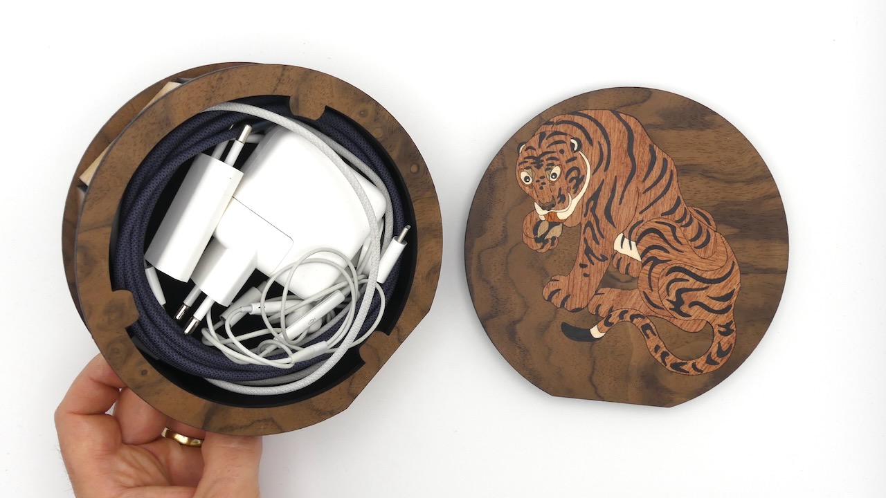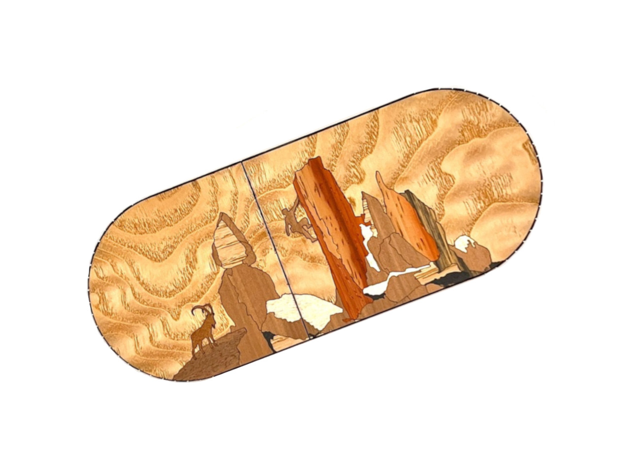 Chaque étui est plaqué en feuille de bois naturel. La face supérieure est ornée d'une marqueterie. L'intérieur de l'étui est habillé d'une élégante feutrine noire. La structure est en contre-plaqué de hêtre pour assurer solidité et légèreté. La fermeture de l'étui est assurée par un fermoir magnétique incrustré et caché dans la structure du boitier. Par sa nature même (feuille de bois naturel), chaque étui est un modèle élégant et unique.
